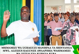 MSIMAMIZI WA UCHAGUZI MANISPAA YA SHINYANGA MWL.ALEXIUS KAGUNZE AWAAPISHA WASIMAMIZI WA VITUO VYA KUPIGIA KURA.
