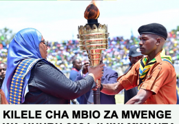 Rais wa Jamhuri ya Muungano wa Tanzania Mhe. Dkt. Samia Suluhu Hassan akipokea Mwenge wa Uhuru kutoka kwa Kiongozi wa Mbio hizo Ndugu Godfrey Eliakim Mnzava kwenye kilele cha Maadhimisho ya Mbio za Mw...