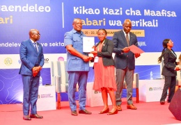 Waziri wa Habari, Mawasiliano na Teknolojia ya Habari Mhe. Nape Nnauye (Mb) akimkabidhi cheti cha pongezi Kaimu Mkuu Kitengo cha Mawasiliano Serikalini Manispaa ya Shinyanga Bi. Jesca Kipingu ikiwa ni...