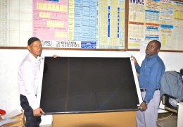 Kaimu Afisa Elimu ya Awali na Msingi Ndg. Ally Liuye wa Manispaa ya Shinyanga akimkabidhi vifaa vya Tehama kupitia Mradi wa Boost Mwalimu Mkuu wa Shule ya Msingi Mwenge Mwl. Hassan Hemed wenye l...